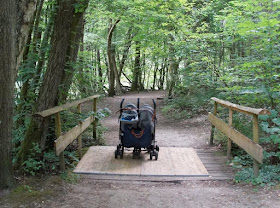 Trotz Wurzeln und gelegentlicher Huppler ist der Spazierweg mit dem Buggy bzw. Kinderwagen noch ganz gut befahrbar. Nur die Brücke auf die andere Seite der Schwentine ist momentan aus offensichtlichen Gründen nicht benutzbar und deshalb gesperrt.